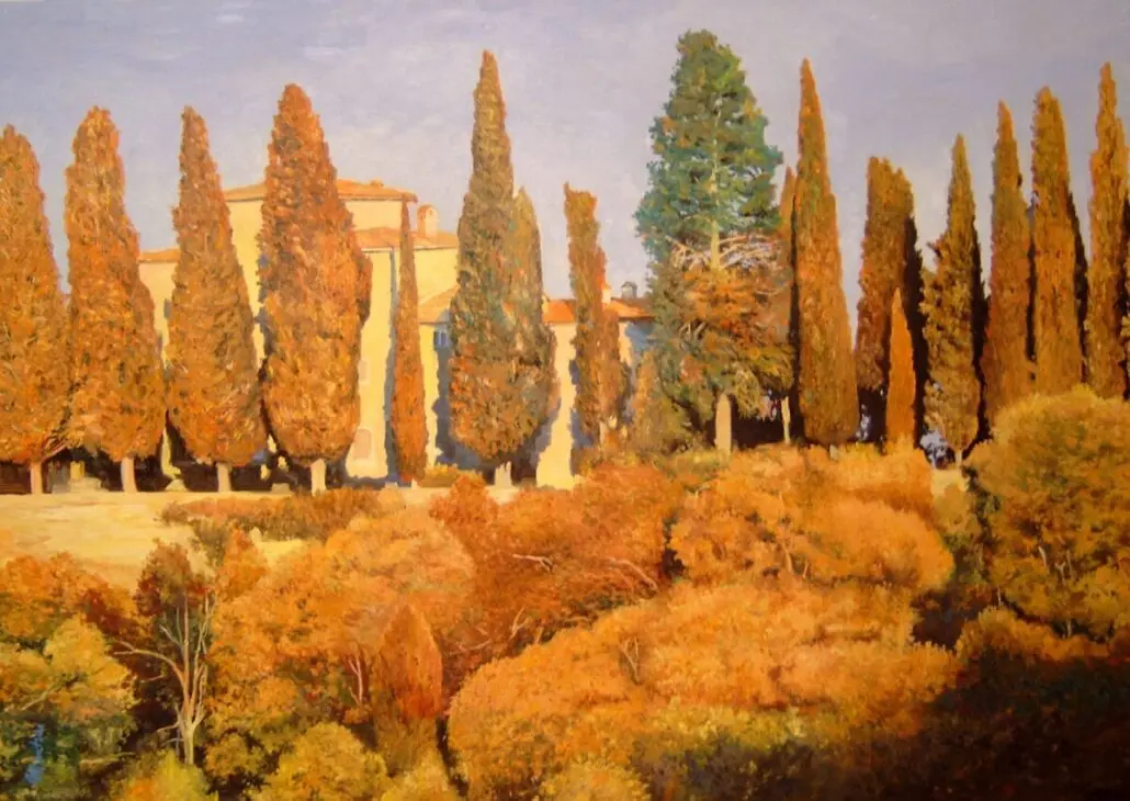 Hommage à Sven Nykvist, Öl / Tempera auf Leinwand 100 x 150 cm. Szene aus dem Filmdrama Offret von Andrei Tarkowski.